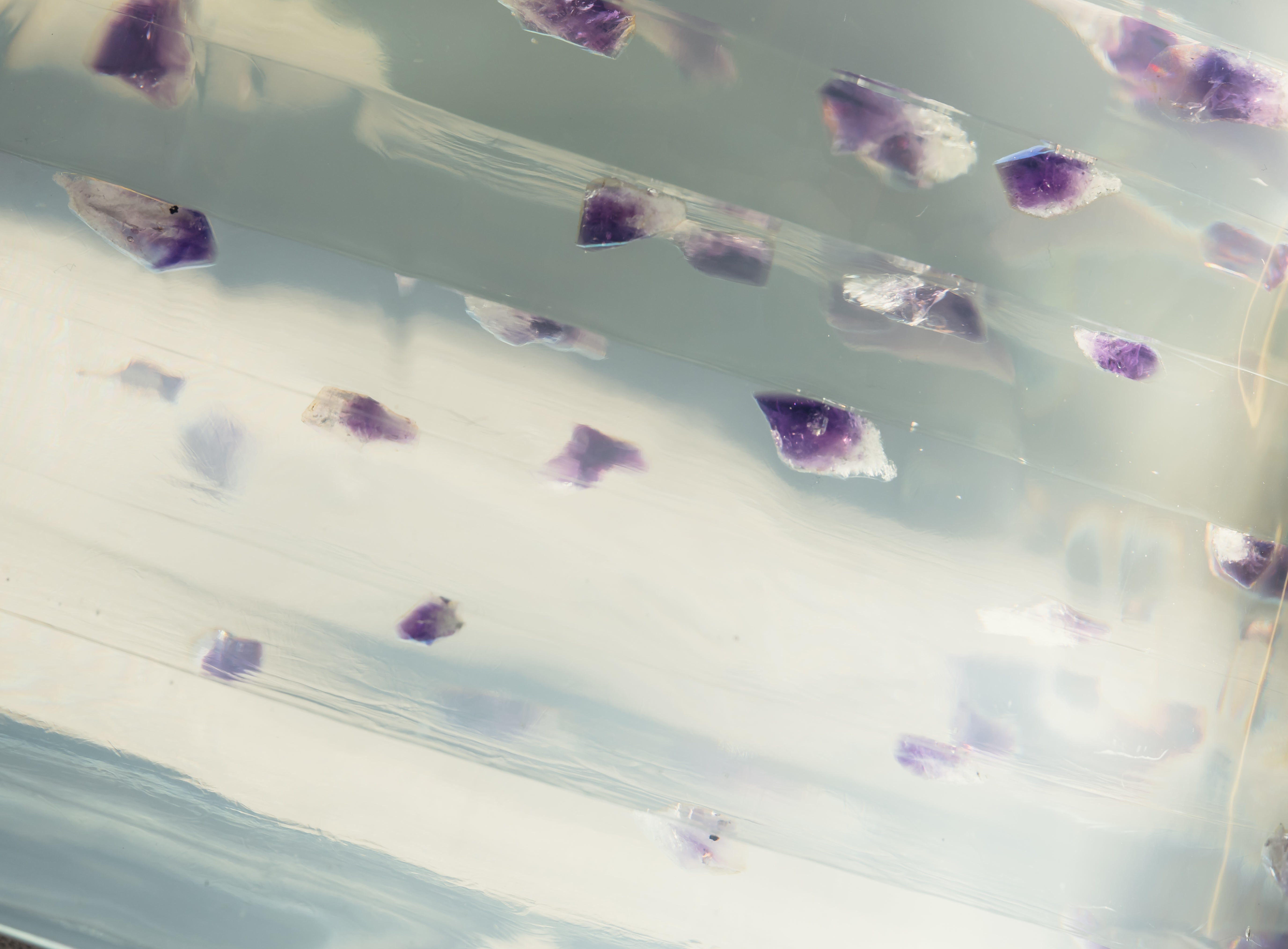 "Levitate and Harmony "minerals suspended in time. Clear resin, luminous as ice, encases natural minerals, such as quartz with smaller tourmaline minerals, and amethyst , transforming them into sculptural forms that appear frozen mid-motion.